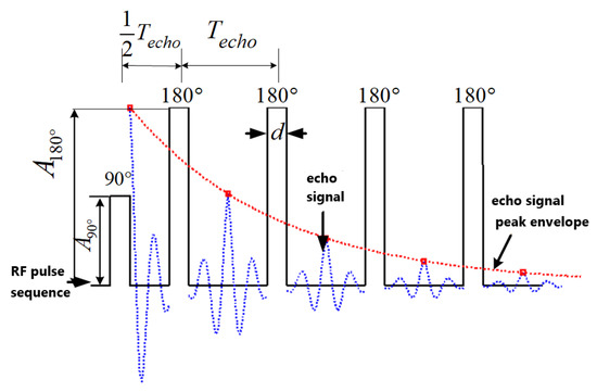 Before the test, samples were washed with absolute ethanol and dried in the shade for 24 h. Since the upper surface is affected by ultraviolet rays and numerous environmental factors, it can reflect the degree of aging more than the lower surface. NMR experiments were performed on the upper surface of the sample, and the transverse relaxation time T2 was obtained. The transverse relaxation time is the time required for the transverse magnetization vector to decay to 37% of the maximum value [18]. For a given substance, the size of T2 can reflect the aging degree of the sample, the lower the T2, the greater the aging degree of the sample [19]. Room temperature and sample temperature affect the determination of T2, and the magnetic field’s polarization causes the sample’s heating. The experimental data were measured at constant room temperature in a single session. In the NMR experiment, the CPMG (Carr–Purcell–Meiboom–Gill) pulse sequence was utilized to excite the sample, as shown in Figure 2; d is the pulse width, Techo is the echo time, A180° and A90° are the 180° pulse amplitude and the 90° pulse amplitude, respectively.