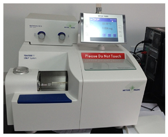 TGA is a simple technique for measuring change in weight with temperature. It provides decisive data for material and product design as well as information about aging stability. The TGA analyzer model used in this study was TGA/DSC1/1600LF. The TGA analyzer is shown in Figure 5. In this study, the heating rate was 10 °C/min, the carrier gas was nitrogen (50 mL/min), and the scanning range was from room temperature to 750 °C.