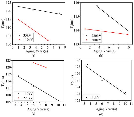 The years of aging of the samples from each factory and the transverse relaxation time T2 are shown in Figure 8.