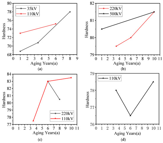 - Sheds with the same years of aging and voltage levels from different factories had different hardness values. For example, factories A, C, and D all produced samples with voltage of 110 kV and an aging period of 6 years, with hardness 75.2, 83, and 76.5, respectively.