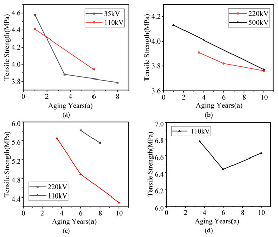 - Sheds with the same aging period and voltage level from different factories had different tensile strengths. For example, the factories A, C, and D all produced samples with a voltage level of 110 kV and an aging period of 6 years, and their tensile strengths were 3.94 MPa, 4.89 MPa, and 6.44 MPa, respectively.