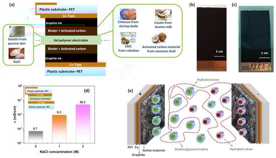 (a) Cross section of the symmetric carbon-based supercapacitors fabricated with sustainable materials; (b,c) photographs of the top view of the half structure of the device before and after the deposition of the transparent hydrogel, respectively; (d) ionic conductivity at 300 K as a function of the NaCl concentration within the hydrogel; (e) schematic diagram of a hydrogel polymer electrolyte (gelatin/NaCl/H2O) between two carbon electrodes. The cross section of the cell structure used to perform the conductivity measurements within the electrolyte is shown in the inset.