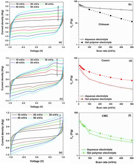 The cyclovoltammetry curves of symmetric carbon-based supercapacitors fabricated with different binders (such as chitosan, casein and CMC) and by using a hydrogel as electrolyte are shown in Figure 2a,c,e. To avoid any chemical reactions due to the water decomposition within the GPE, the operation voltage of the SCs has been limited to a range of ±1 V [36]. The experimental data related to the CV curves for different binders, measured in the higher scan rate region (υ ≥ 100 mV/s), are shown in Figure S2a–c. As can be observed from Figure 2a,c,e, the investigated devices exhibit a fairly rectangular shape of the voltammetric curves at a lower scan rate region (υ ≤ 50 mV/s).