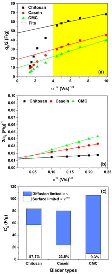 (a) Dependence of qs on υ−0.5 and (b) of 1/qs on υ0.5 for the binders investigated in hydrogel 2 M NaCl; (c) contribution of pseudocapacitance (diffusion-limited) and double-layer capacitance (surface-limited) to the overall capacitance for all the binders investigated. Here, qs is the total voltammetric charge. The yellow box area indicates the region where the linear fitting procedure is performed.