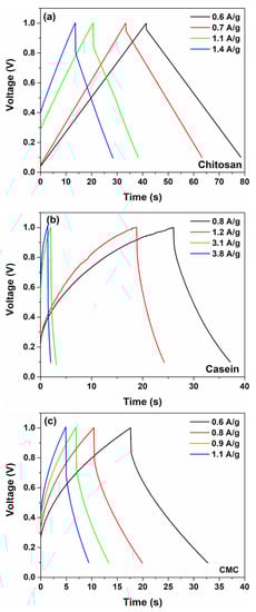 Figure 3c shows the contributions of pseudocapacitance (diffusion-limited) and double-layer capacitance (surface-limited) to the overall capacitance for different binder types with hydrogel as electrolyte. As expected, when the total charge is stored both with faradaic and double-layer charge storage mechanisms that occur concurrently at the electrode/hydrogel surfaces. However, only the chitosan reports a higher value of the double-layer contribution (more than 55%) to the total capacitance with respect to the other binders suggesting a substantially pure capacitance behaviour. Conversely, the electrodes based on casein and CMC show a merely pseudocapacitive behaviour, with more than 80% of originating from the fast faradaic reactions. The use of the hydrogel as an electrolyte modifies the contribution of the double-layer capacitance with respect to the SCs fabricated with the aqueous electrolyte [32], as evidenced in Figure 3c and Figure S4. It seems that the GPE promotes the pseudocapacitive behaviour assisted by charge transfer. Here, the GPE is based on a blend of gelatin and water–glycerol molecules and contains a large number of polar functional groups, which can be influenced by an electric field polarization. Moreover, gelatin is a protonic conductor and also contains a large number of divalent ions (i.e., Ca2+, Cu2+ and Fe2+) that can diffuse and participate in the storage mechanism. These ions can act as a dopant with electrode materials (activated carbon and binder) and give origin to pseudocapacitive behaviour. Additionally, the salt anions (Cl−-H2O) interact with the hydrophilic -OH, -COOH and -NH2 groups in the structure of gelatin within the hydrogel, thereby increasing solubility and the cation transport properties [34]. As expected, the observed pseudocapacitance influences also the galvanostatic charge–discharge profiles. The GCD curves measured at different current densities for the fabricated SCs are displayed in Figure 4.