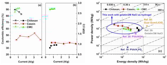 The pseudocapacitive behaviour at the electrode/hydrogel interfaces modifies the coulombic efficiency of the devices. This quantity can be calculated as the ratio between discharging and charging times when the charge–discharge current densities are equal. In Figure 5a, the values computed from the GCD profiles at different current density values are shown. As can be observed, the efficiency is lower than 100% indicating that the contribution to the overall capacitance from the pseudocapacitance is not negligible [46,47]. Here, values for the CMC and the chitosan ranged between 85 and 95%. These values are in good agreement with what is found in the literature for the same binders [32]. Conversely, the electrode based on casein shows a lower value of of about 50%. This means that the presence of non-linear curves, related to the pseudocapacitance, is caused by an asymmetric behaviour within the device during the charging and discharging tests. Here, the capacitance value is no longer a constant during the GCD under bias current. This finding leads to a reduction in the discharge time, compared to the charging time, which negatively affects the real capability of the device to store energy efficiently [48].