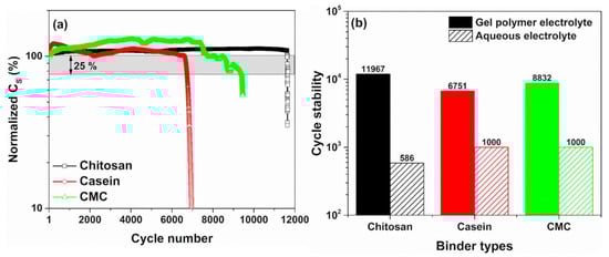 Figure 6a shows the endurance of the devices under cycle voltammetry measurements performed at 300 mV/s and in the voltage range between 0 and 1 V. It is worth noting that the capacitance values measured for the SCs investigated are in good agreement with what has been reported in Figure 2. As evidenced, the device with a dominant contribution of the double-layer capacitance shows a stable behaviour of the dielectric properties up to 12,000 working cycles (e.g., chitosan as a binder). On the other hand, the casein and the CMC-based supercapacitors, where the contribution of the faradaic reaction at the interface is most significant, exhibit lower cycle stability estimated at 8832 and 6751, respectively. These cycle number values are estimated by considering a reduction of 25% from its initial capacitance value. Moreover, all the devices with hydrogel show an enhancement of the dielectric properties ranging between 10 and 30% during the cycling test. This trend has been already observed for the casein and the CMC as binder immersed in an aqueous electrolyte [32]. This finding is a further evidence that faradaic reactions at the electrode interface are supported when the GPE is used.