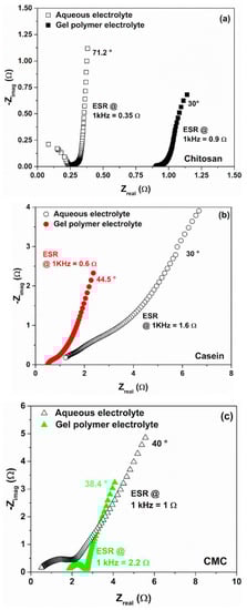 It is worth noting that only for the casein, the SC with hydrogel shows lower ohmic contribution with respect to the same device with reference liquid electrolyte. This finding is in good agreement with what has been reported in Figure 2d and confirms the better dielectric properties observed for the GPE sample. Moreover, the device based on CMC shows a clear semicircle loop with a diameter of about 1 Ω, lower than that observed for the liquid electrolyte (1.9 Ω), suggesting an increase in the exchange current from the charge-transfer processes at the electrode/hydrogel interface [63].