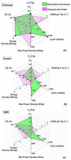 In Figure 8a, a comparison in terms of the lifespan (cyclic number), energy and dielectric performances of the investigated supercapacitor by varying the binder types and for both the electrolytes is reported. Aqueous electrolytes are superior, compared the other ones, in terms of their ionic conductivity, interfacial wettability, safety and environmentally benign nature [16]. The experimental data indicate that hydrogel enhances the stability of the final device increasing the endurance up to 12,000 cycles (e.g., for chitosan as binder with GPE). Although the internal resistance increases with the gel-like electrolyte the dielectric properties, in terms of specific capacitance and energy performances, still remain. Here, the chitosan used as a binder shows better properties compared to the other binders with hydrogel as an electrolyte.