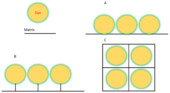 Dye immobilization can be achieved by two different methods: physical and chemical. The main difference between these methods lies in the strength of the bond between the matrix and the dye. If they are weak interactions, in the form of hydrogen bonds, etc., then it is a physical method. In the case of covalent bonding, it is the chemical method [41,42,43,44]. Schematically shown in Figure 1. The methods of binding matrix to dye almost the same as in supramolecules between their two or more parts [45].