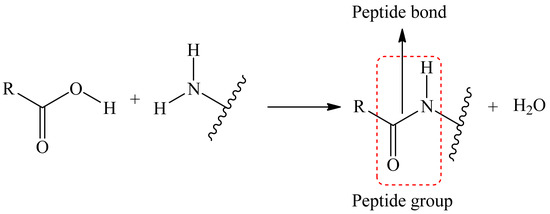 The reaction to form a covalent bond can be anything; the main thing to keep in mind is that the conditions for this reaction must not destroy the matrix as well as the dye itself. As an example, we can take the reaction where the reaction of the carboxyl tail (matrix/dye) with an amino group (dye/matrix) forms a covalent bond between two substances, i.e., a peptide bond is formed (Figure 3).