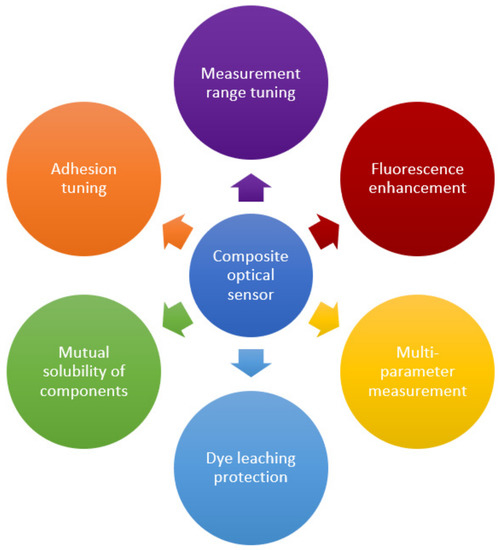 The development of optical sensors is often faced with a situation where the matrix material must satisfy a number of specific requirements that may contradict or interfere with each other. One of the most common is that the material must provide porosity for the transfer of the analyte, but at the same time immobilize the indicator dye [161]. Particularly in the case of a pH sensor, this means that matrix must be hydrophilic to measure in water, while the hydrophobic dye containers must be provided to ensure a high signal intensity. This problem could be solved in different ways, for example, by creating a double-layer composite [162], or by incorporation of polystyrene (PS) nanoparticles (NPs) into the organically modified sol–gel (ORMOSIL) polymer. The latter makes it possible to fulfill all the opposite requirements for the materials of optical sensors. Any hydrophobic fluorophore could be incorporated in this layer, even those one that are susceptible to quenching in water.