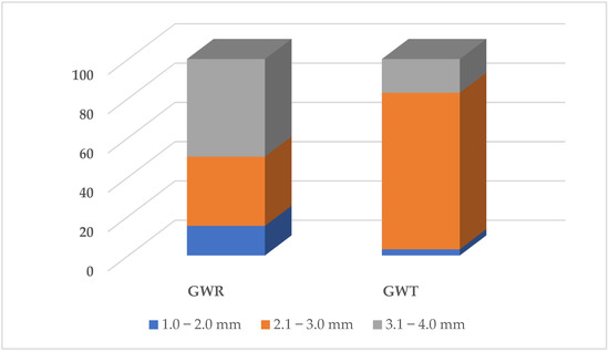 The size of the granulate from waste tire—“GWT”—was from 1.0 to 4.0 mm (size distribution in Figure 1). The granulate consisted of the processed material SBR (styrene–butadiene rubber).