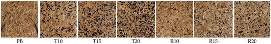 The single-layer particleboard with the addition of crushed waste rubber had the dimensions of 360 × 280 × 15 mm, and was prepared in laboratories of the Technical University in Zvolen, Slovakia. The moisture content of the particles mixed with UF resins was 9.5%. A particleboard was prepared using common technology, i.e., firstly, particle mats were cold-prepressed at 1 MPa, followed by hot pressing in pressure (CBJ 100–11 laboratory press, TOS, Rakovník, former Czechoslovakia) with a maximum temperature of the pressing plates in the press of 230 °C, a maximum pressing pressure of 6.50 MPa and a total pressing time of 356 s, which had to be longer than in the conventional production of all-wood particleboards due to the presence of crushed waste rubber [29]. Six boards of each condition were produced with the average density ranging from 554 to 615 kg·m3 (Figure 2, Table 1). For the composite characterization, the bending strength (MOR) test was performed on ten replicates per sample according to EN 310 [30], as well as the water absorption and thickness swelling tests after 2 and 24 h according to the STN EN 317 standard [31]. Measurements of physical properties were carried out on six samples per composite. The principle was to place samples into water and to record the thickness and weight after 2 and 24 h (Table 2).