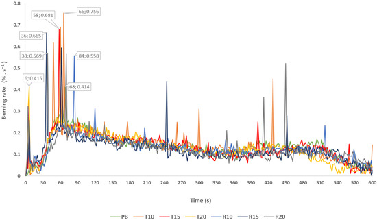 At the thermic load with a heat flux of 30 kW·m−2 of PB samples, the time to initiation was 34 ± 0.05 s, the time to reaching a maximal burning rate was 68 s and the maximal burning rate was 0.414%·s−1. Similar values were recorded for the T10 samples, where the time to initiation was 34 ± 0.12 s, the time to reaching a maximal burning rate was 66 s and the maximal burning rate was 0.756%·s−1. Based on the determination of the time to initiation 32 ± 0.09 s and the maximal burning rate, the R10 samples reached the highest time for reaching the maximal burning rate, which was 84 s, and the maximal burning rate, which was 0.558%·s−1. Based on the results in Table 4, the time to initiation and the maximal burning rate were comparable for all samples tested. However, with the increasing percentage of waste tires and waste rubber, there was a shorter time to initiation recorded. This indicated a lower thermal stability of the samples (R15, R20, T15 and T20). Based on the monitored fire-technical parameters, the time to initiation, the maximal burning rate and the time to reaching the maximal burning rate, there was the assumption that the R10 and T10 samples reported almost identical values as the PB samples (samples without an admixture), which indicated their comparable thermal stability.