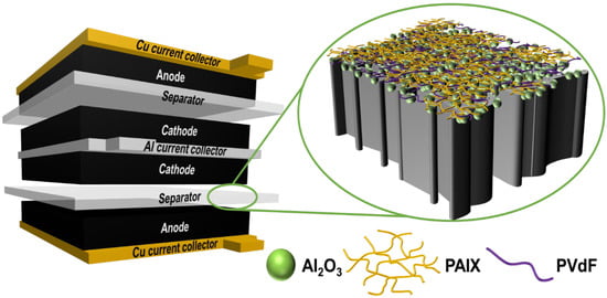 A separator coated with a hybrid organic/inorganic layer was placed between an NCA cathode and graphite anode; the hybrid layer was in contact with the cathode, as shown in Figure 1. The hybrid layer comprised inorganic Al2O3 nanoparticles, organic PAIX, and a PVdF binder. The inorganic-coated polyolefin is inexpensive (<$1 m−2), dimensionally stable, and highly wettable in carbonate electrolyte, whereas the polymer-coated separator is flexible, forms intimate contact with the electrode, and has better electrolyte uptake [28,29,30,31,32]. However, the inorganic-coated polyolefin is brittle after thermal treatment, and the polymer coating is less robust against mechanical failure modes. Therefore, the hybrid organic/inorganic coating was designed to exploit the advantages and compensate for the disadvantages of each layer component.
