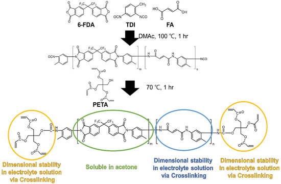 Hexafluoroisopropylidene-bis-phthalic anhydride (6-FDA; Sigma-Aldrich, Burlington, MA, USA), toluene diisocyanate (TDI; Sigma-Aldrich, Burlington, MA, USA), fumaric acid (FA; Sigma-Aldrich, Burlington, MA, USA), and pentaerythritol triacrylate (PETA; Sigma-Aldrich, Burlington, MA, USA) were used as monomers to design a crosslinkable polyamide-imide (PAX). 6-FDA, FA, and TDI were polymerized at a monomer ratio of 0.9:0.1:1.1 in dimethylacetamide (DMAc; Sigma-Aldrich, Burlington, MA, USA) 100 °C for 1 h. The monomer content in DMAc was 60 wt %. 6-FDA was used to ensure solubility in acetone, and FA and TDI were selected to promote dimensional stability in the electrolyte solution and crosslinking. To improve crosslinking, the residual-NCO group was capped with PETA at a monomer ratio of 6-FDA + FA + TDI:PETA of 1:1, at 70 °C for 1 h. The PAIX was characterized using gel permeation chromatography (GPC; Waters Co., Ltd., Milford, MA, USA) and thermogravimetric analysis (TGA; Discovery TGA; TA Instruments, New Castle, DE, USA).