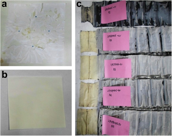 Photographs of separator samples following dry and wet thermal tests. (a) Acrylate- and (b) hybrid PAIX/AL2O3-coated separators after dry thermal treatment at 200 °C for 10 min, and (c) disassembled acrylate- (top) and hybrid PAIX/Al2O3-coated (second to fifth) separators after immersion in an electrolyte solution at 150 °C for 1 h.
