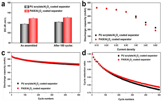 The electrochemical performance of the separator with a hybrid organic/inorganic layer was tested by incorporating it into cylindrical mini-18650 cell assemblies. As shown in Figure 6a, the average DCIR of the as-assembled reference cell with an acrylate-coated separator was 117.6 mΩ and the DCIR of the separator with a hybrid PAIX coating was 128.6 mΩ. The impedance of the PAIX-based cell was greater than that of the reference cell because of its relatively low permeability. However, the structural stability of the PAIX-based separator meant that the DCIR value increased by < 1.7 mΩ after 100 charge cycles, whereas the reference cell DCIR increased by 4 mΩ. Figure 6b shows that the discharge capacity of the cells was similar at lower rates (≤ 0.5C), but the capacity of the PAIX cell was lower than that of the reference cell at higher discharge rates. At 1.0, 3.0, and 5.0C, the PAIX cell discharge capacity was 94.9%, 89.0%, and 81.5% of the reference cell capacity, respectively. This is because of the higher DCIR of the PAIX cells. Figure 6c,d present the cycling performance of the reference and PAIX cells, respectively. The cells were cycled 500 times each at 1.0C, after which the better cyclability of the PAIX cell was clear. The discharge capacities of the reference and PAIX cells after 500 cycles were 416.3 and 425.5 mAh, respectively, which were 77.0% and 78.6% of the initial discharge capacities, respectively. These tests suggest that although the hybrid PAIX/Al2O3 coating worsens electrolyte permeability, the negative effects are less significant at low current densities, and the performance improves over many cycles. Based on the material properties and electrochemical performances, it was summarized as follows: i) the electrochemical performances of the PAIX cells at low rates (≤ 0.5C) were comparable to the that of the reference cell, ii) the discharge capacities of the PAIX cells at high rates were inferior to the reference cells due to the lower permeability, and iii) the discharge capacities of the PAIX cells after 500 cycles were higher than that of the reference cells owing to the improved structural stability. Therefore, we conclude that a separator coated with a hybrid PAIX/Al2O3 layer has a minor negative impact on the cell rate performance, but improves the thermal stability at high temperatures even when the cell is filled with electrolyte.