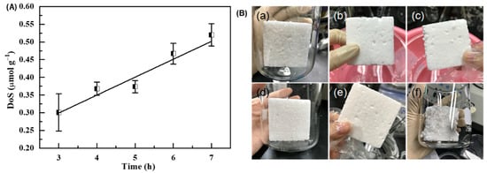 (A) DoS as a function of sulfonation time, and (B) digital photos of SPS foams with sulfonation times of (a) 3, (b) 4, (c) 5, (d) 6, (e) 7 and (f) 8 h.