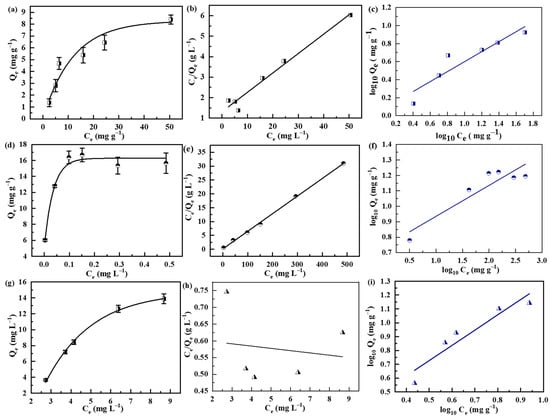 The adsorption isotherms were first recorded by plotting the equilibrium adsorption uptake (qe (mg g−1)) against the equilibrium substrate concentration (Ce (mg L−1)). Figure 4a,d,g display the adsorption isotherms of Pb2+, lysozyme and MB, respectively. To determine the adsorption constant and maximum adsorption capacity, the isotherms were further analyzed by the Langmuir and Freundlich models, as expressed by Equations (3) and (4), respectively.