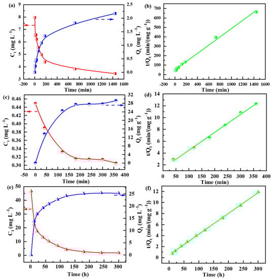 Adsorption kinetics of (a) Pb2+, (c) lysozyme and (e) MB by SPS foams, and (b,d,f) corresponding fitting curves obtained by the pseudo-second-order equation. (The red arrow points to the left axis, the blue arrow points to the right axis.)