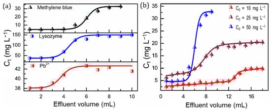 (a) Breakthrough curves for the penetration of the pollutants through the SPS foams and (b) dependence of breakthrough curves on the initial concentration of MB.