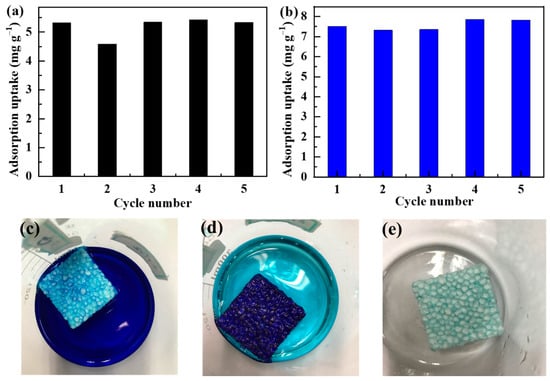 For practical applications, the cyclic performance of the sorbents is also critical. To this end, the desorption of the Pb2+- and MB-saturated SPS foams was conducted by immersing them in 1 M HCl. The regenerated SPS forms were re-utilized to remove the pollutants from aqueous solutions. This adsorption–desorption process was repeated five times and the adsorption uptakes were recorded. Figure 7a,b show the adsorption uptakes of Pb2+ and MB, respectively, as a function of cyclic number. It reveals that the adsorption uptakes are quite stable, indicating the outstanding cyclic performance of the SPS foams. Figure 6c–e show the digital photos of SPS before and after the adsorption of MB and after desorption, respectively, which vividly reveal the adsorption and desorption processes. It is noteworthy that the regeneration process is quite easy and does not involve any separation process because of the bulky three-dimensional structure of the SPS foams.