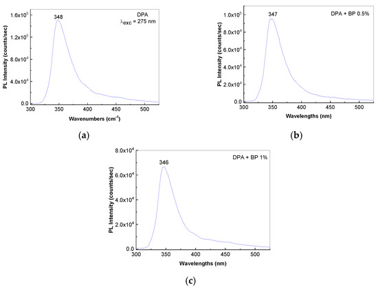 In order to illustrate the interaction of BP with DPA, Figure 3 shows the PL spectra of DPA and the mixture of DPA:BP when the BP concentration is equal to 0.5 wt.%. and 1 wt.%.