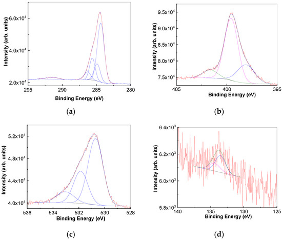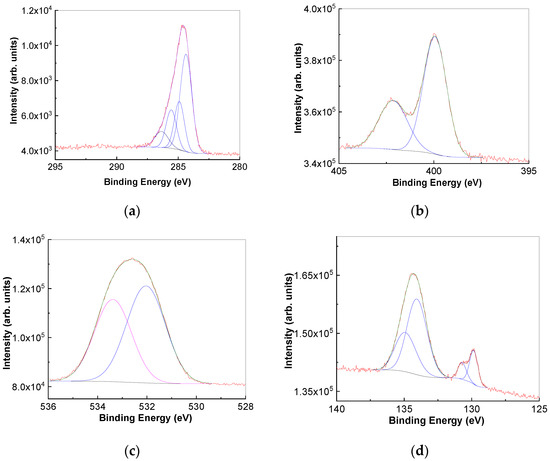 Figure 9 shows the case of PDPA electrochemically functionalized BP sheets in: (i) XPS C1s, with the four peaks at 284.37 eV, 284.91 eV, 285.57 eV and 286.36 eV assigned to sp2 C atoms, the C-C and C-H bonds, the C-N bond and the C-O and C-N+ [42]; (ii) XPS N1s, with two peaks at 399.94 eV and 402.14 eV, assigned to the P=N bond [46,47,48] and protonated N (C-N+) [42]; (iii) XPS O1s, with two peaks at 532.04 eV and 533.38 eV, attributed to adsorbed molecular oxygen and the C-O bond; and (iv) XPS P2p, with four peaks at 134.06 eV–134.93 eV and 129.85 eV–130.71 eV, assigned to P=N bond and the P-P bond in BP [46,47,48]. The ratio between the intensities of the peaks at 129.99 eV and 133.63 eV is equal to 0.92. The smaller value of the ratio between the intensity of the peaks at 129.99 eV and 133.63 eV in the case of the PDPA electrochemically functionalized BP sheets in contrast with BP clearly confirms the decrease in the weight of P-P bonds and the increase in the weight of P=N bonds.