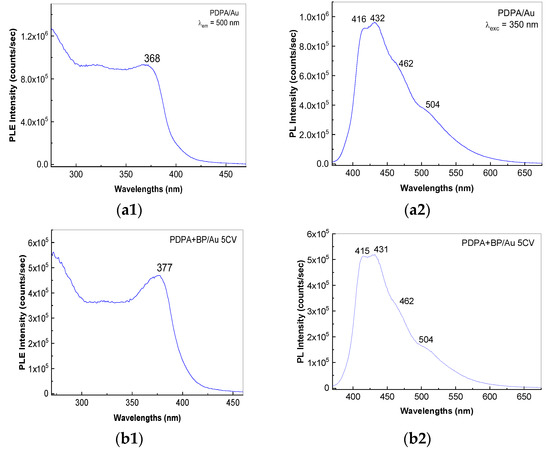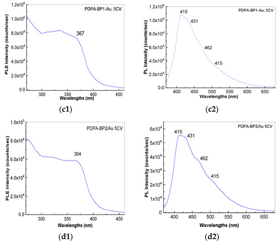 The electrochemical oxidation of DPA in the absence of the BP sheets, when the recording of the first five cyclic voltammograms on the Au electrode surface took place, led to films that are characterized by spectra of photoluminescence (PL (Figure 10(a1))) and photoluminescence excitation (PLE, Figure 10(a2)), having the following characteristics: (i) the PL spectrum of the sample of PDPA shows four emission bands with maxima at ~416 nm, 432 nm, 462 nm and 504 nm and (ii) the PLE spectrum highlights a band with the maximum at 368 nm. As the concentration of the BP sheets in the synthesis mixture increases, a gradual decrease in the intensity of the PL spectra of the macromolecular compound resulting from the electrochemical oxidation of the DPA chemically functionalized BP sheets was observed from 9.62 × 105 counts/s (Figure 10(a2)) to 5.16 × 105 counts/s (Figure 10(b2)), 1 × 105 counts/s (Figure 10(c2)) and 5.5 × 104 counts/sec (Figure 10(d2)). A decrease in the intensity of the PLE spectra was also observed in the case of Figure 10(a1–10d1). These variations are due to the electrochemical oxidation of the DPA chemically functionalized BP sheets, when are generated dimers, tetramers, oligomers and macromolecular compound. Taking into account the behavior of PL spectra, shown in Figure 10, these highlight the role of the BP sheets as a PL quenching agent of macromolecular compounds of DPA doped with PTA heteropolyanions.