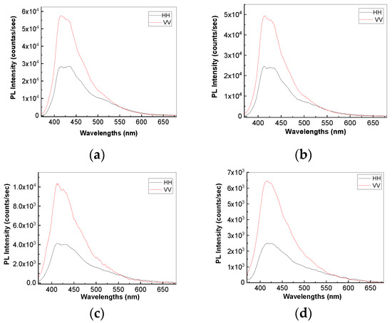 In order to understand the adsorption mode of macromolecular compounds of DPA doped with PTA heteropolyanions on the surface of the BP sheets, in Figure 11 are shown the PL spectra in polarized light of PDPA doped with the PTA heteropolyanions and of its composites based on macromolecular compounds of DPA and the BP sheets. To calculate the PL anisotropy, the following equation was used: r = (IVV − (IHV/IHH) × IVH)/(IVV + 2(IHV/IHH) × IVH) [39,49]. IVV and IHH correspond to the PL intensity when the excitation and emission polarizers are in the vertical and horizontal positions, respectively; IVH and IHV correspond to the PL intensity when the excitation and emission polarizers are in the vertical and horizontal positions and vice versa, respectively. The r values in the case of PDPA doped with PTA heteropolyanions and the composites of the type of the BP sheets electrochemically functionalized in the presence of DPA, when in the reaction mixture the concentrations of BP sheets are 0.1, 0.2 and 0.5 mg/mL, equal to 0.109, 0.103, 0.153 and 0.127, respectively. The wrapping angle of the BP sheets with macromolecular compounds of DPA—in other words, the adsorption angle of the polymer on the surface of the BP layers ((θPL)—was calculated with the relation r = 0.4[3cos2θPL − 1)/2] [39,49], having values in the case of PDPA and the composites containing BP sheets equal to 44.1°, 44.7°, 42.4° and 39.9° when the concentrations of BP layers in the reaction mixture are 0, 0.1, 0.2 and 0.5 mg/mL, respectively. These values of the adsorption angle of the polymer on the surface of the BP layers indicate that the excitation and emission transition dipoles of macromolecular compounds are not parallel to the basal plane of the BP sheets.