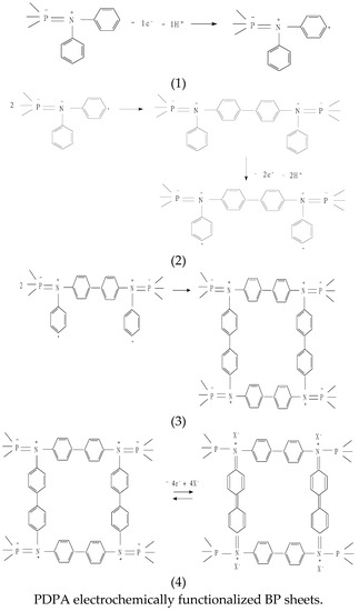The reactions describing the electrochemical oxidation reactions of the DPA chemically functionalized BP sheets, which leads to composites with BP sheets electrochemically functionalized with macromolecular compounds having repeating units made through doping DPA with PTA heteropolyanions (X- corresponds to the PTA heteropolyanion).