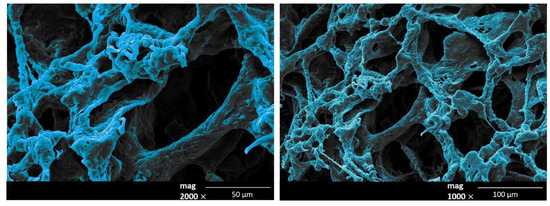 The morphology of FC (without CrD-Ore) was investigated using scanning electron microscopy (SEM). First, samples were instantaneously frozen in liquid nitrogen (−196 °C) and posteriorly lyophilized for 24 h in a Thermo Micro Modulyo freeze dryer (Thermo Electron Corporation, Pittsburgh, PA, USA). Afterward, the sample was metalized in a BAL-TEC (SCD 050-Sputter Coater model, Balzers, Liechtenstein) and its morphology was evaluated (enlargements of 100 e 50 µm) in a FEI Quanta 250 microscope (Thermo Fisher Scientific, Karlsruhe, Germany) [43]. Formulations containing CrD-Ore were not evaluated due to the oil-phase mobility, which was maintained even after the dry process.