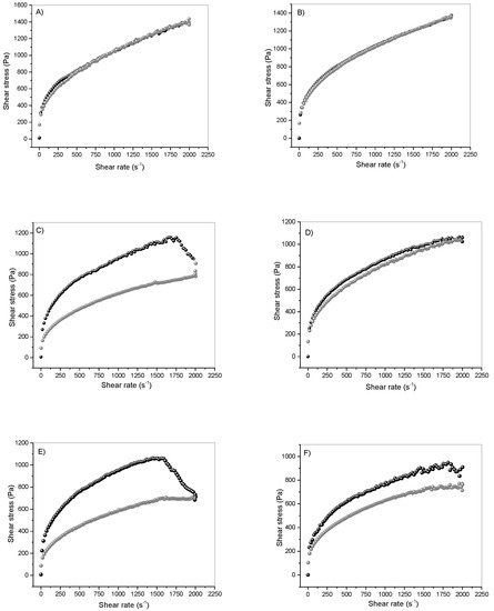 Flow curves of emulsion systems: (A) FC at 25.0 °C; (B) FC at 37.0 °C; (C) ECO15 at 25.0 °C; (D) ECO15 at 37.0 °C; (E) ECO20 at 25.0 °C; (F) ECO20 at 37.0 °C. The symbols