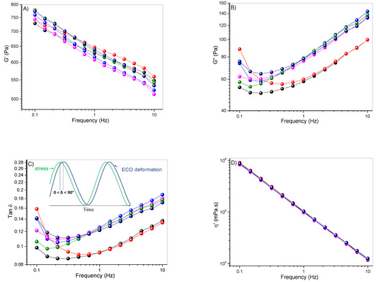 Evaluations involving the oscillatory analysis were performed to predict ECO behavior when exposed to different natural body/skin movement stresses. Elastic (G’) and viscous (G”) modulus refer to the energy storage capacity and the dissipated energy quantity (by chains movements/relaxations), respectively. These components describe the viscoelasticity of the ECO sample and the oil-resin incorporation effect. The polymer blend is subjected to cyclic (sinusoidal) stresses, resulting in sinusoidal ECO deformations. The ECO strain and the applied stress can be compared, and the lag angle provides information regarding the structuring of the system. In this way, lag angles between 0 ≤ δ ≤ 90° provide a viscoelasticity property to the system (insert Figure 4C), with δ equal to the relationship G”/G’ [65]. The oscillatory profiles for EFG systems are presented in Figure 4.