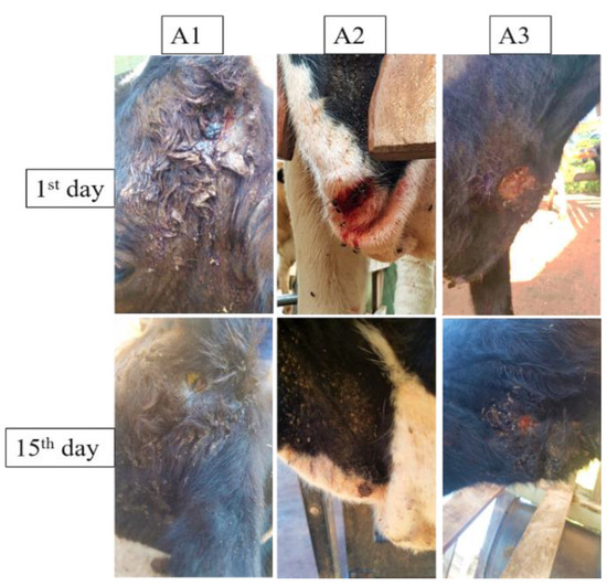 Monitoring photographs of animals treated (A1–3) with CrD-Ore. The pictures show deep lesions in the head region (horn removal wound in cattle—A1) and chest (accidental lesions—A2 and A3).