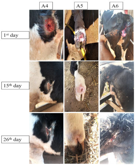 The animals (Figure 7) showed signs of wound infection. The A4 animal presented an abscess on the wound (before treatment). The A5 animal exhibited secretions typically observed for bacterial infections, and the A6 injury showed a constant bleeding wound. The ECO20 offered adequate adhesiveness when applied, forming a barrier with improved thickness. Possibly, it allowed gas exchange and acted as a protective film, constraining several microorganisms. Additionally, the softness of the EFG allowed pain-free administration to the animal. The repellent effect of ECO20 was also observed [37], which avoided larval infestation and the progression of the myiasis injury. Indications of a curative effect were observed in the first week of treatment. After 15 days of administration, the lesions of A4 and A6 animals were completely dried. Notably, the A5 animal showed significant improvement after 20 days of administration, since the wound was placed in a region of constant movement and frequent friction. Although there were tangible signs of progress after 15–20 days of administration, the ECO20 was administered up to day 26 to ensure full recovery and strength of the new tissue.