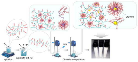 Firstly, water and Cb were mixed until complete homogenization (Table 1 and Scheme 1). Then, F127 copolymer was added, and the system was stored overnight at 5 ± 2 °C. Next, the mixture was stirred using a mechanical stirrer (Q235-2 model, Quimis, São Paulo, SP, Brazil) (30 min, average speed of about 1000 rpm), and the pH was adjusted to 7.0 using TEA. CrD-Ore mass was slowly dripping, and the system was vigorously mechanically stirred for 30 min. After preparation, all EFG formulations were stored at room temperature for at least 24 h before each analysis. The system obtained without oil-resin (only polymers and water mixture) was called FC (F127 and Carbopol—blank system). The formulations with oil-resin were called ECOoil concentration (ECO10, ECO15, and ECO20). The ECO abbreviation represents emulsion-filled gel with copaiba oil.