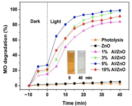 Photocatalytic efficiency of aluminum doping with different content (inset shows the color change in MO at time intervals 0 and 40 min).