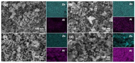 FE-SEM and elemental mapping images of: (a) 1% Al/ZnO; (b) 3% Al/ZnO; (c) 5% Al/ZnO; and (d) 10% Al/ZnO photocatalysts.