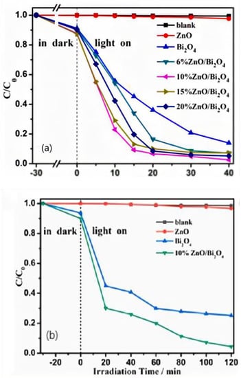 Danping Wu et al. [] successfully synthesized zinc oxide/Bi2O4 heterojunctions with different proportions by the one-step hydrothermal method. The results showed that 10% zinc oxide/Bi2O4 had the best photocatalytic degradation efficiency of methyl orange and ciprofloxacin, which was 97.5% and 95.6% as shown in Figure 8, respectively, 40.7 and 28.3 times of pure zinc oxide. Various characterization techniques and photoelectrochemical tests demonstrated that the enhanced photocatalytic activity was due to the formation of heterojunctions between zinc oxide and Bi2O4 with low charge transfer resistance and effective electron–hole pair separation.