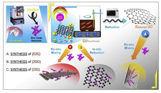 Since the discovery of graphene in 2004, the two-dimensional honeycomb-like lattice structure of graphene, which consists of a single layer of carbon atoms packed tightly together, had been characterized by its excellent electrical, thermal and mechanical properties, by the majority of scientific research workers of great concern [,,,]. Materials such as zinc oxide are considered to be an excellent material for pollutant degradation because of good carrier properties and high electron mobility. Because of its relatively large surface area as a catalyst, the graphene composite is able to absorb more pollutants, and its excellent electron mobility and carrier properties facilitate the transfer and separation of light-excited charges; graphene semiconductor composites are considered to have great potential to further improve the list of semiconductor materials of low visible light utilization and the high probability of excited electron–hole recombination; the synthesis of zno nanorods, go, reduced go, and their nanocomposites is shown in Figure 9. It is due to the introduction of graphene that the hole–electron recombination efficiency of the graphene/zinc oxide composite is reduced, while the active site is increased to increase the photocatalytic efficiency [].