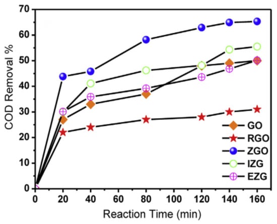 Ahmed F. Ghanem et al. [] decorated the graphene surface with 5% zinc oxide nanorods and evaluated the demineralization of synthetic wastewater by chemical oxygen demand, the photocatalytic activity of the obtained nanocomposite was 30% and 35% higher than that of pure reduced and reduced graphene oxide as Figure 10 shown. This increase in efficiency can be attributed to the synergy between the planar structure of zinc oxide and graphene, resulting in the development of an unprecedented polycrystalline structure.