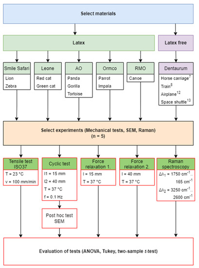 In previous studies, there were big differences between the methodology of the studies analyzed, which makes it difficult to draw the right conclusions. At the beginning of our study, we assumed that there are significant differences in the elongation at the break of tensile between the products of different manufactures. Therefore, the aims of the present study are to test different types of intermaxillary elastics in terms of mechanical behavior, under standardized testing conditions, and evaluate the force degradation by 24 h cyclic tensile fatigue test and tension relaxation test. We hypothesize that there is a significant difference between latex-containing products and latex-free elastics during dynamic testing. The study also examines the morphological changes of intermaxillary elastics after loading with scanning electron microscopy and determines the chemical composition of the elastomers based on the peak absorption intensities, using Raman spectroscopy [25,26]. According to the literature review, these parameters have not been investigated in a large number of studies, despite the fact that they have significant clinical relevance. Additionally, the study provides recommendations to orthodontists for the treatment of various class II anomalies with different elastomers.