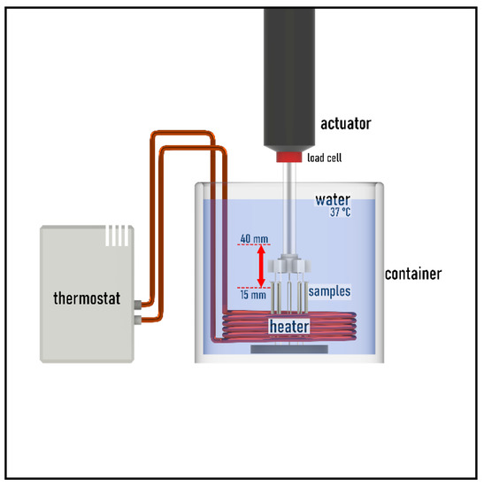 The chamber was added to a Zwick/Roell e/m actuator (ZwickRoell, Ulm, Germany). A 5 kN load cell was placed on the testing machine, which was calibrated with a PCE-BS 3000 laboratory scale (PCE Holding GmbH, Hamburg, Germany) before the test. The sample holder of the chamber was designed to keep measuring five ligatures at once, which resulted in more efficient use and faster measurements (Figure 2). The test lasted for 24 h and during this time the holder stretched the ligatures between 15 mm and 40 mm with sinusoidal movement on 0.1 Hz frequency.