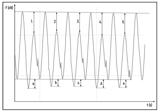 The force degradation curve was determined using the OriginPro 2018 program (OriginLab Corporation, Northampton, MA, USA) with maximum peak detections when stretched at 40 mm and minimum peak detections when stretched at 15 mm. To determine measurement uncertainties during the 24 h test, the ligatures were unhooked one by one from the load cell at 0 h, 1 h, 3 h, 6 h, 12 h and 24 h for one full sinusoid cycle (Figure 3). Following this step, it was possible to calculate the ligatures’ individual values from the force decrease. The individual values were summed and then compared with the load cell value. If the two values were different, each value was corrected proportionally so that the summed value was equal to the load cell value (Supplementary Materials: Measured values and Statistic.xlsx and cyclic fatigue individual value sheet).