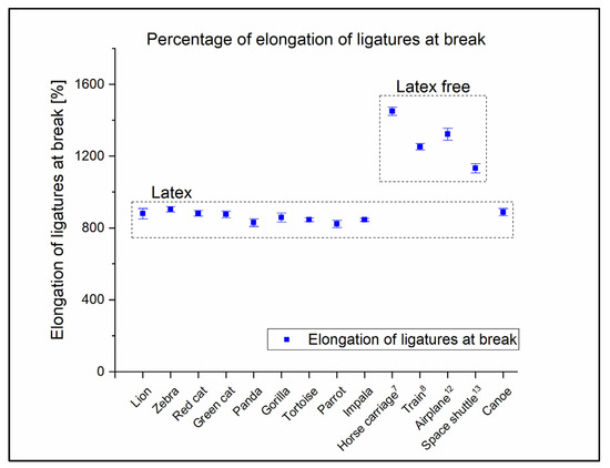 Considering the dental industry applications of these ligatures, tensile strength (Fmax) was measured in cN instead of MPa. Additionally, elongation measured in mm is more important than the elongation percentage, with regard to the dental industry (Table 2). Nonetheless, the standard elongation percentages are also indicated in Table 2, thereby helping the comparison of the raw materials. These results show that the latex ligatures broke, approximately, at the same elongation regardless of the manufacturer (Figure 5).