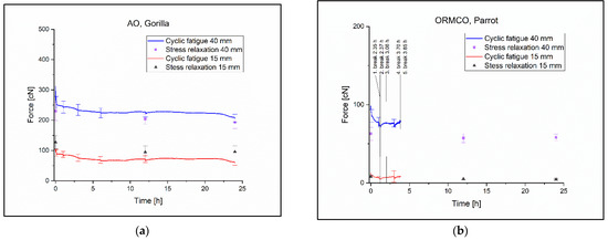 During the 24 h of cyclical tests, the Gorilla type containing latex was the only one that did not present any torn ligatures (Figure 6a). Significant changes were observed in the pulling force between 0 h and 24 h: 255.5 cN ± 20.68 cN at 0 h and 208.3 ± 13.38 cN at 24 h (p = 0.003). The same observations were made considering the pulling force at 40 mm elongation in the Tukey test at 1 h and 24 h: 244.2 cN ± 19.28 cN was measured at the 1 h (p = 0.036) (Table 3). The cases in which changes were less than 5% in the confidence interval with the Gorilla ligature at 40 mm elongation were: between 3 h and 6 h, where the pulling force was 233.3 cN ± 18.06 cN at 3 h and 225.2 cN ± 16.13 cN at 6 h, between 3 h and 12 h, where the pulling force was 225.6 cN ± 16.58 cN at 12 h, and between 6 h and 12 h. The p values and the changes of the averages are shown in Table 3. The changes were less than 5% in the confidence interval at 15 mm elongation in the following cases: between 0 h and 1 h, between 3 h and 6 h, between 3 h and 12 h, and between 6 h and 12 h. All cyclical and stress relaxation test results can be found in the Supplementary Materials: Cyclic tests’ and Stress relaxations’ diagrams folder. Their descriptive statistics can be found inside the Measured values and Statistic.xlsx file in the cyclic descriptive and stress relaxation individual values sheets.