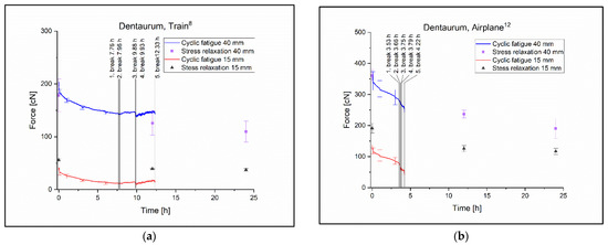 The worst performing ligature was the Airplane12 with the last ligature torn at 4.22 h and the pulling force decreasing approximately linearly during the test (Figure 7b). The pulling force was 344.7 cN ± 29.68 cN at 0 h and 291.2 cN ± 23.94 cN at 3 h, the p value in the Tukey test with 40 mm elongation was p = 0.3 (Table 4).